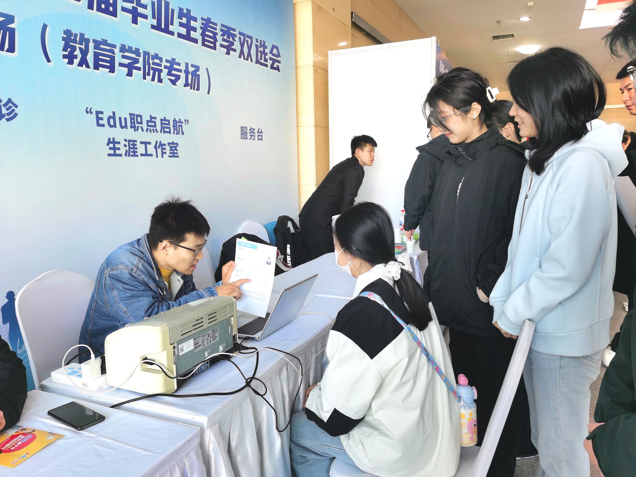 招聘会现场,教育学院“Edu职点启航”生涯工作室开展简历门诊、就业政策咨询台等多项就业指导服务活动,为学生提供政策咨询、简历指导等便捷的就业服务,全面满足毕业生就业需求,助力毕业生全面提升就业竞争力。